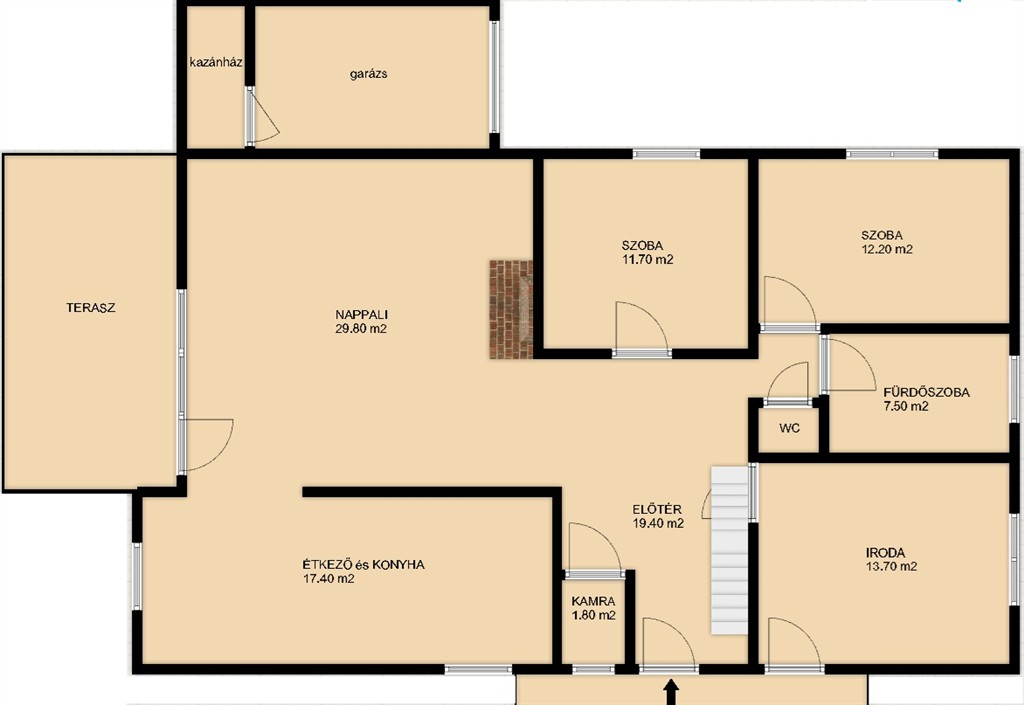 A ház földszinti része 116 m2 alapterületű, rendkívül szellős, a mai kor igényeinek abszolút megfelelő elrendezéssel : nyitott konyha étkezővel, az étkező és a nappali egy légtérben. A nappali központjában gyönyörű cserépkályha áll.