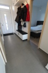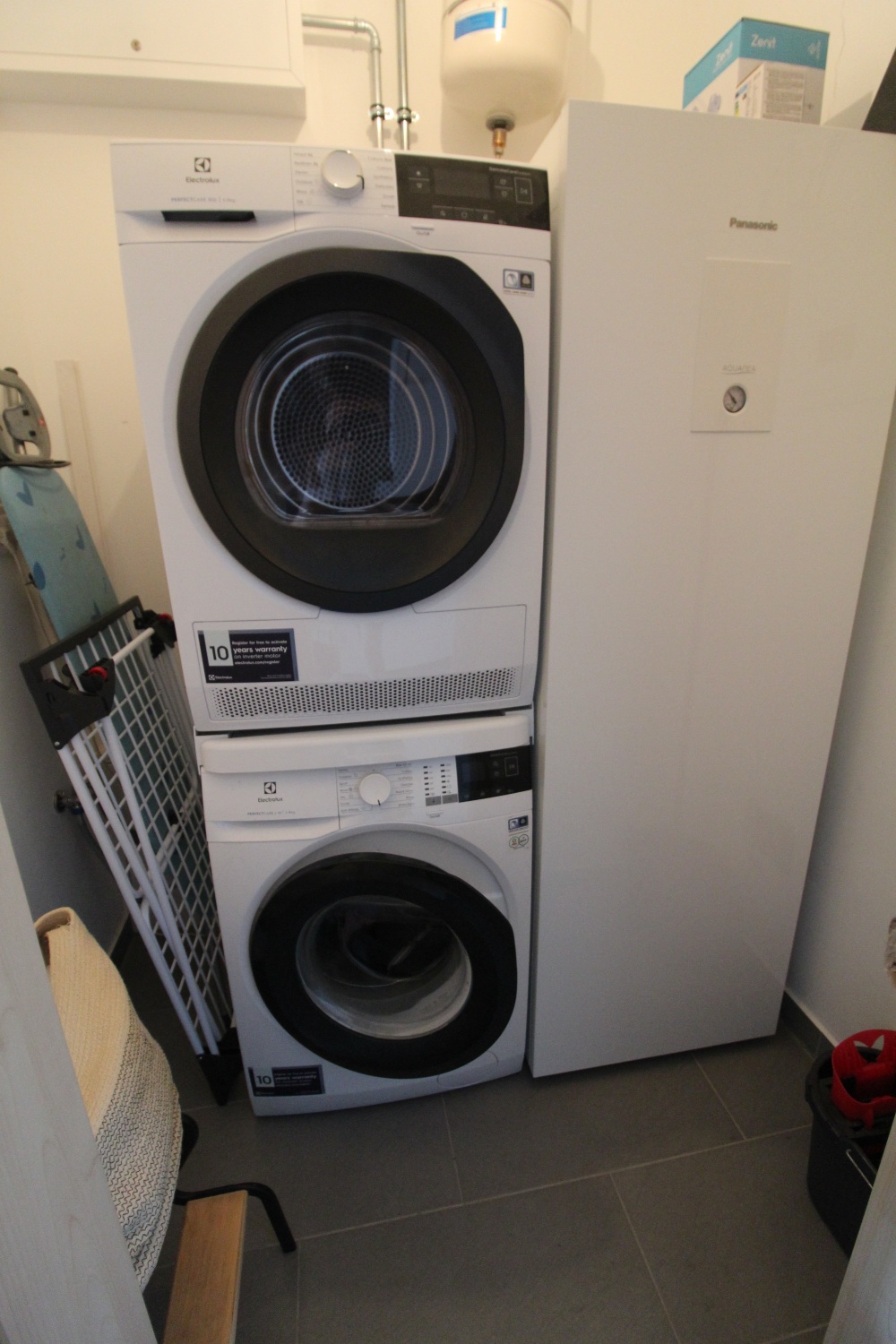 A hőszivattyú a melegvíztárolóval együtt a bejárat melletti mosókonyhában kapott helyet.