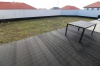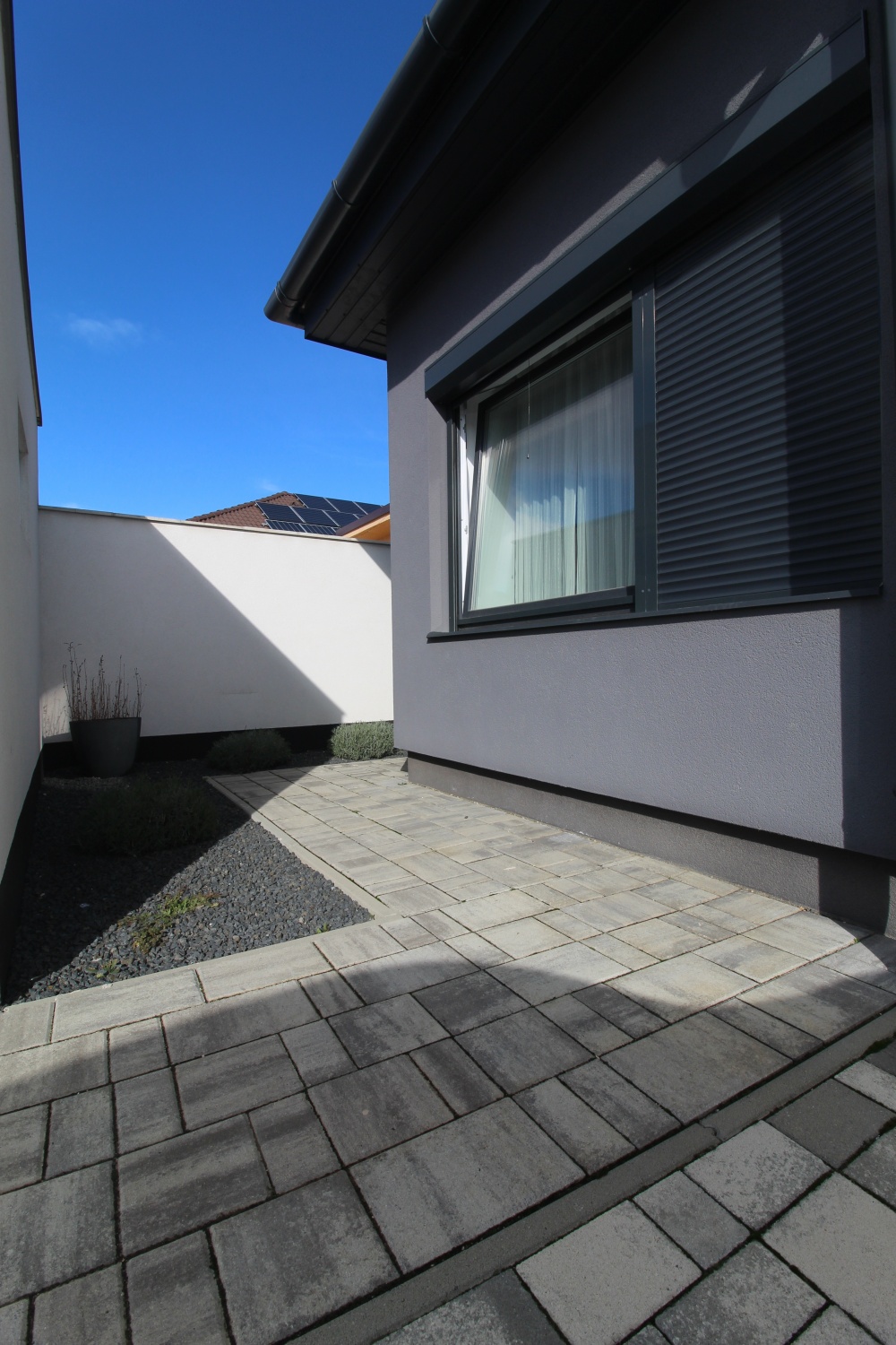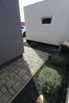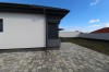 A kényelmes nagyságú teraszt borító vpc burkolat színe a tetővel és a nyílászárókkal teljes összhangban van. A terasz fölé egyedi pergola készült.