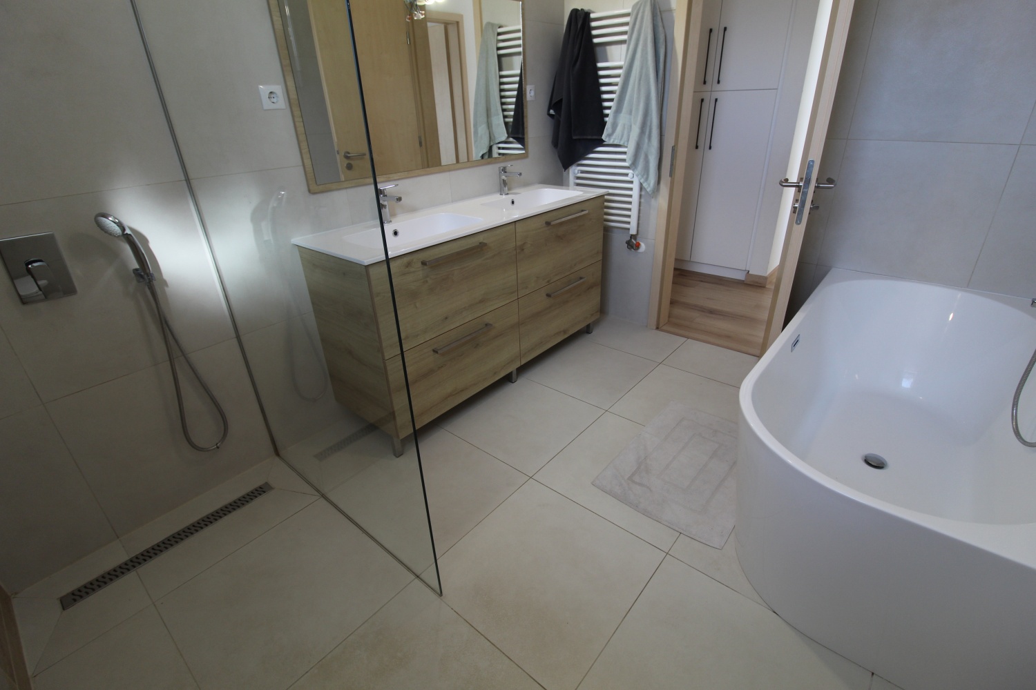 A másik két hálószoba és a fürdőszoba külön közlekedő felől nyílik. A nagyméretű fürdőszobában kád és épített zuhanyzó is helyett kapott.